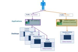 The GRC Solutions application is linked to the Risk Assessor profile and the HOPEX Solutions (Windows Front-End) application is linked to the Architect profile.