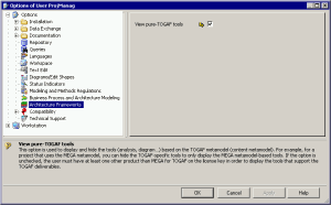 The means of providing native TOGAF deliverables, such as document templates, diagrams, reports, etc. are provided by the HOPEX Suite for TOGAF application. As such, when this application is combined with another complementary application of the HOPEX Modeling Suite, the TOGAF tools as well as the extended set of tools from the other applications are visible. To allow users to filter the type of tools visible, an option has been added. By default, this option is checked, allowing users to only have access to TOGAF tools.