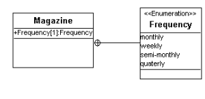 The "Magazine" class has an attribute called "Frequency". This attribute is based on the "Frequency" type of the "Enumeration" stereotype. The possible values are therefore "monthly", "weekly", "semimonthly", and "quarterly".