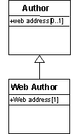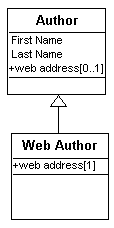 The "Author" class has a "Web Address" attribute. This attribute is overloaded in the "Web Author" class. The difference between the original version and the overloaded version of the attribute is its multiplicity: in the first case the attribute is optional, and in the second case it is required.