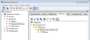 In the "Enterprise" schema, the "Employee" element defines a "REFPerson" secondary key. This key references the "IDPerson" primary key.