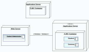 The deployment diagram complements the component diagram. It describes hardware resources (computer, router, etc.) in the system, and indicates distribution of components on these hardware resources.