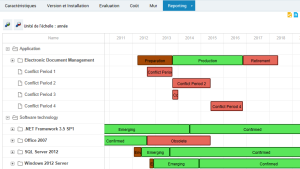 Un rapport permet d’afficher dans un même diagramme de Gantt les étapes du cycle de vie de l’application et de ses installations.
