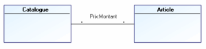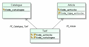 - Une table dont la clé primaire est constituée uniquement de clés étrangères devient une association de multiplicités (*..*). S’il existe des colonnes de la table qui ne font pas partie de la clé primaire, chacune de ces colonnes donne lieu à la création d’un attribut qui est rattaché à l’association.