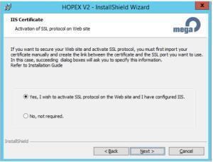 4. Choose to activate use of SSL/TLS or not. SSL/TLS is highly recommended; however, it requires some prior configuration of IIS (see Prerequisites section). Moreover, don’t choose “Yes” unless the certificate is deployed in IIS. Otherwise, the installation will roll back:
