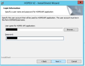 6. Enter the username and password of the Windows User for Mega Hopex you have chosen in the previous section of this document. It will be used for impersonation of the Web application: