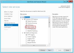 4. In the “Role Services” of IIS, make sure that “Static Content” is checked: