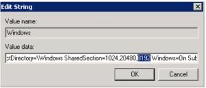 It is the Shared Section part that might need to be modified. The three values are, in order: the shared heap, the interactive desktop heap, and the non-interactive desktop heap. They are expressed in KB. Default values vary significantly between Windows versions. You will need to modify the non-interactive desktop heap.