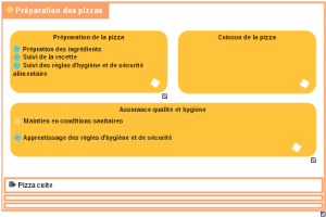 Par exemple, "Livraison des pizzas" utilise "Préparation des pizzas". A noter que le résultat attendu (effet métier) de "Livraison des pizzas" est une "Pizza livrée" et le résultat attendu (effet métier) de "Préparation des pizzas" est une "Pizza cuite"