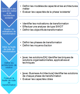 Initier la feuille de route de transformation : cette troisième étape s'appuie sur la description des systèmes opérationnels de l'entreprise, effectuée lors de la première étape ainsi que sur l'analyse de motivations de transformation, pour planifier les changements à prévoir pour réaliser les objectifs de transformation et donc définir les moyens d'action (stratégies et tactiques) à mettre en œuvre en vue d'atteindre les objectifs définis et de renseigner les capacités métier exposées pour chaque phase d'entreprise.