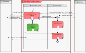 Par exemple, le processus "Traiter les demandes d’achat urgente" est mis en œuvre par un processus applicatif "Analyse demande d’achat" pour assurer à la fois la rapidité et l’efficacité du traitement.