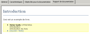 Le texte d’un livre, ou d’un chapitre, est accessible dans l’onglet Rapport de documentation de sa fenêtre de propriétés.