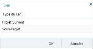 Elle vous propose de choisir entre le lien "Projet Suivant" qui indique une séquence entre deux projets et le lien "Etape de projet" qui indique une décomposition.