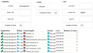 Le résultat du rapport filtre les applications qui contiennent dans leur nom "management", dont les fournisseurs ("Vendor") sont "Microsoft" et "Oracle", et dont les coûts sont supérieurs à 50 000 €.