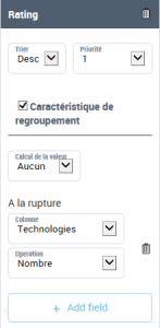 Exemple 1 : à partir d’un Report DataSet qui a pour définition "Application Technologies", sur "Rating", à la rupture sélectionnez les valeurs Colonne : "Technologies" et Opération : "Nombre" pour afficher sur la rupture le nombre de technologies contenues dans le regroupement défini.