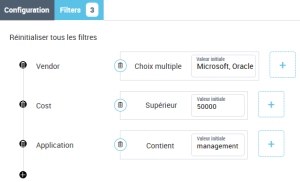 Exemple 4 : à partir d’un Report DataSet qui a pour définition "Application Technologies", sélectionnez "Cost". Puis sélectionnez l’opérateur "Supérieur" et dans le champ "Supérieur" saisissez "50000".