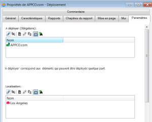 Ex. : un rapport de type "Déploiement" met en relation le paramètre "A déployer" (qui définit les éléments déployés) et le paramètre "Localisation" (qui définit les emplacements cibles).