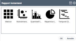 Vous pouvez créer un rapport instantané de type matrice, multidimensionnel, quantitatif (barres), par répartition (circulaire, barres) ou temporel.