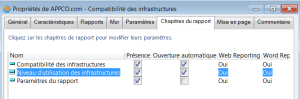 Les chapitres d’un rapport varient en fonction du rapport type. Dans les résultats du rapport vous avez la possibilité d’afficher certains chapitres et d’en cacher d’autres.