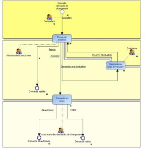 Dans le dernier cas, la demande de changement passe au statut Demande en cours d’évaluation. Après l’évaluation, le modélisateur soumet le résultat de l’évaluation à l’administrateur des demandes de changement (la demande revient au statut Demande soumise).