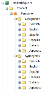 Si vous dépliez le dossier associé à un concept, les termes et synonymes sont accessibles, dans toutes les langues disponibles pour votre environnement HOPEX.