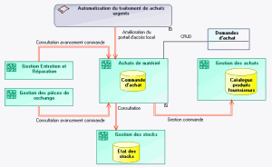 L’application "Achat de matériel" utilise l’application "Gestion des stocks" pour consulter et mettre à jour les informations concernant l’état des stocks de pièces détachées. Elle utilise également l’application "Gestion des achats" avec la base "Catalogue" pour passer une commande d’achat.