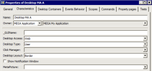 A desktop is linked to a MEGA Application. To define connection modes of the desktop of an application, you must open the Properties of the desktop from the MEGA Application.