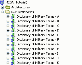 Before you can access this dictionary from the NAF navigation window you must first import it into the HOPEX interface from the HOPEX Administration application.