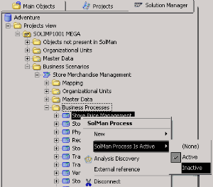 The Active/Inactive status associated to each SolMan object indicates whether or not the object (and its sub-hierarchy) is to be used in the project. Inactive objects are not used in projects but are still present in the project and are still exchanged between