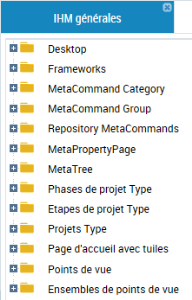 Vous pouvez gérer les accès aux IHM générales pour un profil. Les IHM générales sont classées par catégorie :