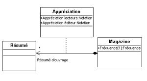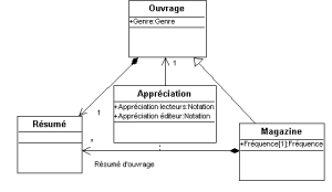 Dans ce contexte d'utilisation, les résumés d'ouvrages basés sur la classe "Résumé" se voient pourvus d'attributs supplémentaires : "Appréciation lecteurs", "Appréciation éditeur". Ces attributs additionnels sont modélisés par la classe associative "Appréciation".