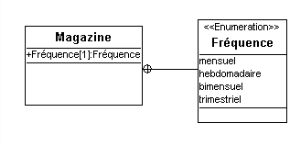 La classe "Magazine" dispose d'un attribut "Fréquence". Ce dernier est basé sur le type "Fréquence" de stéréotype "Enumération". Les valeurs possibles sont "mensuel", "hebdomadaire", "bimensuel" et "trimestriel".