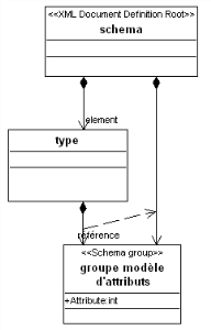 Les classes de stéréotype "schema group" servent à modéliser tant les groupes modèles d'éléments que les groupes modèles d'attributs. Une classe groupe modèle représente soit un groupe d'éléments soit un groupe d'attributs, l'un excluant l'autre.