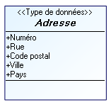 Ici le type Adresse est composé du numéro, de la rue, du code postal, de la ville et du pays.