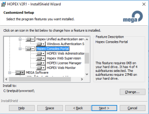 3. The “HOPEX API” feature, above, is needed when you have to add web services on the platform. It requires another Windows user, different from the one used by the “Mega Web Access for Hopex” feature. You will also need to activate the “Mega Web Access for Hopen API” ni the “HOPEX BackEnd” section.