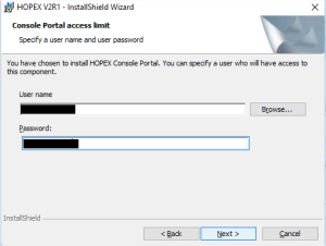 6. Enter the username and password of the Windows User for Mega Hopex you have chosen in the previous section of this document. It will be used for impersonation of the Web application: