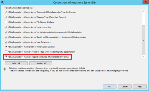 This is the last possible conversion called “MEGA Repository - Convert Report Templates (MS Word) to RTF Format”, that is checked by default:
