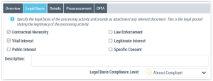 There has to be at least one legal basis selected. If there is no legal basis for the processing activity, the processing activity is considered poorly compliant.