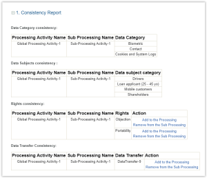 The Consistency report enables you to fix inconsistencies found between processing and sub-processing activities.