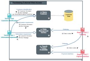The logical application system structure diagram, for managing "Internet Purchase Requests", presents different logical applications, access to a logical database as well as service and request points for "Book" or "Order".