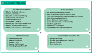 A functionality map describes all the functionalities the enterprise is able to cover for its internal needs or for meeting the needs of its clients.