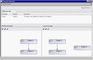 This functionality provides an interface enabling, for example, viewing of certain objects that have been added or deleted in a diagram since a given repository state. It consists of time navigation applied to diagrams.