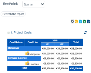 It is possible to configure the cost consolidation period via the Time Period parameter; for example a sub-total of project costs is possible per quarter.