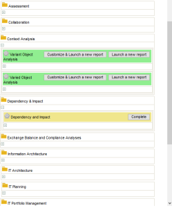 Depending on the HOPEX solutions, dynamic analysis reports are provided by default and sorted by object type.