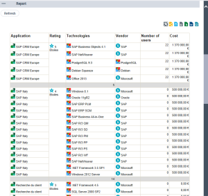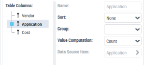 Example 2: from a Report DataSet with the "Application Technologies" definition, for the "Application” column, in the Value Computation field, select "Count" to display the number of applications by "Vendor" and for the "Cost” column, in the Value computation field, select "Sum" to display the sum of costs per "Vendor".