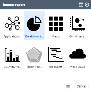 You can create matrix, multidimensional, word cloud, quantitative, breakdown, or time-type instant reports.