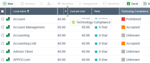 You can, for example, place the Technology Compliance and Global Expense columns directly after Local Name so they remain displayed when you view the other columns. The column scrolling cursor is positioned at the first unfrozen column level (after Global Expense).