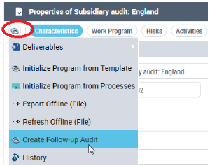 Creating a follow-up audit allows you to duplicate the work program of an audit in a new audit within another audit plan. The new audit resumes work of the original audit work program (themes, activities , worksheets , etc. ) and provides the follow-up of its recommendations, which are not yet closed , to verify their implementation.