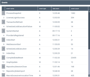 Example: The LicenseLoginSuccess action-type event has been launched 204 times and the last time at 12:02:08.