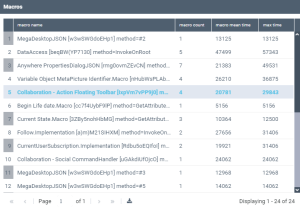 The Macros view is displayed and lists all the macros with a long execution time for the defined period (by default, data is reset every two weeks).